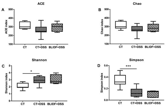 Effect of BLIDF on the bacterial α-diversity in cecal contents of colitis mice. (A) ACE, (B) Chao, (C) Shannon, and (D) Simpson index (n = 8 per group). * p < 0.05, *** p < 0.001.