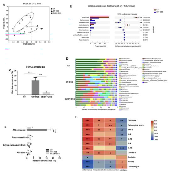 BLIDF alleviated DSS-induced gut microbiota dysbiosis. (A) Principal coordinate analysis (PCoA) based on Chord distance matrix at operational taxonomic units (OTU) level; (B) Comparison of gut bacterial composition of group CT and CT+DSS at the phylum level (determined Wilcoxon rank-sum test at FDR < 0.05); (C) Relative abundance of Verrucomicrobia; (D) Gut bacterial composition at the genus level; (E) Relative abundance of Akkermansia, Parasutterella, Erysipelatoclostridium, and Alistipes. (F) Spearman correlations analysis between the microbiota and intestinal inflammatory-related index. DAI score, Disease activity index score. * p < 0.05, ** p < 0.01, *** p < 0.001.