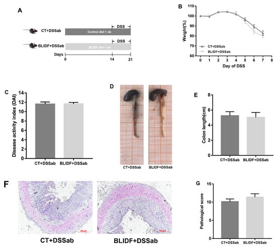 For experiment II, after adaptation for 7 days, 16 mice were treated with an antibiotics mixture (ab) containing ampicillin, metronidazole, and neomycin (1 g/L; Sigma–Aldrich, St. Louis, MO, USA) and vancomycin (500 mg/L; Sigma–Aldrich) in drinking water for 14 days and divided into CT+DSSab and BLIDF+DSSab groups, 4 mice per cage. The ab-containing water was changed every 3 days. After 14 days of the ab treatment, DSS was added to the ab-containing water (2.5% w/v) (water was changed every 2 days) and administrated for 7 days. Group CT+DSSab were fed a control diet, and group BLIDF+DSSab were fed BLIDF diet throughout the experiment.