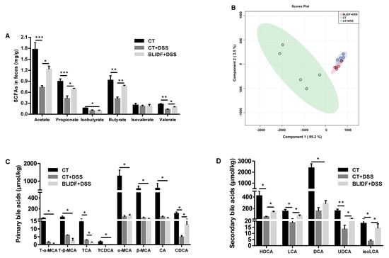 Bile acid metabolism dysregulation is reported in fecal samples of IBD patients and mice [30,32]. In our work, 13 major bile acids were quantified, and the profiles of the bile acids varied significantly among the groups of mice (PERMANOVA, 999 permutations, R2 = 0.65996, p = 0.001) (Figure 6B). DSS induced a dramatic reduction in cecal contents’ primary bile acids, including tauro-α-muricholic acid (T-α-MCA), tauro-β-muricholic acid (T-β-MCA), taurocholic acid (TCA), TCDCA, α-muricholic acid (α-MCA), β-muricholic acid (β-MCA), cholic acid (CA), and chenodeoxycholic acid (CDCA), as well as the secondary bile acids hyodeoxycholic acid (HDCA), lithocholic acid (LCA), DCA, ursodeoxycholic acid (UDCA), and isolithocholic acid (isoLCA) (Figure 6C,D). This result concurs with a previous study that bile acids dramatically decreased in DSS-treated mice feces [33]. BLIDF supplementation shifted the bile acids profile in DSS-treated mice toward that of the control group (Figure 6B). It significantly decreased primary bile acids TCA and increased CDCA (Figure 6C). Notably, BLIDF supplementation altered the secondary bile acid composition. It increased the concentration of isoLCA in colitis mice to the level of the CT group and increased HDCA, LCA, and UDCA levels by 2.57-, 3.88-, and 2.04-fold, respectively, compared with the CT+DSS group (Figure 6D). These findings suggested that BLIDF supplementation can restore the DSS-induced dysregulation of microbiota-derived metabolites.