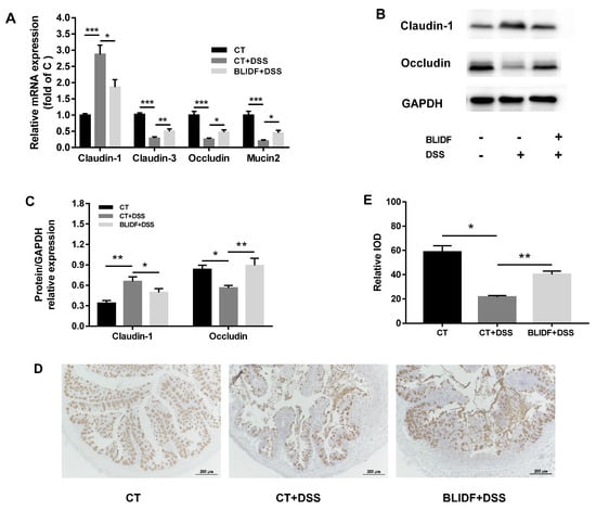 The impaired gut barrier is a prominent characteristic of colitis in DSS-treated mice [34]. In our study, DSS administration induced a considerable decline in the mRNA expression of claudin-3, occludin, and mucin2 and elevated claudin-1 mRNA expression in colonic tissue, which were reversed by BLIDF administration (Figure 7A). Moreover, BLIDF significantly reversed the DSS-induced increase in expression of claudin-1 and the DSS-induced decrease in expression of occludin and mucin2 (Figure 7B–D). These results suggested that BLIDF supplementation likely recovered DSS-induced intestinal barrier damage by regulating the mucus and tight junction protein expressions.