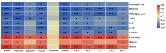 Pearson correlation analysis between the SCFAs, secondary bile acids and intestinal inflammatory-related index. DAI score, Disease activity index score. * p < 0.05, ** p < 0.01, *** p < 0.001.