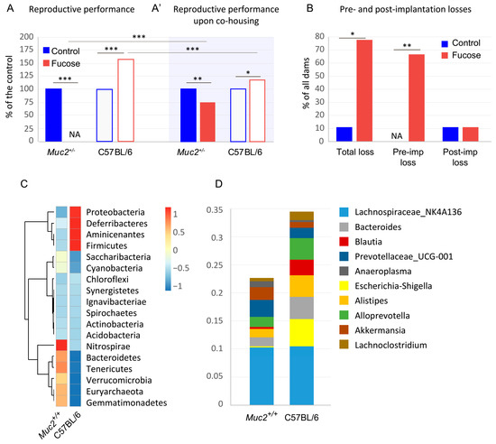 Fucose affects reproductive performance in Muc2+/− and C57BL/6 dams. (A). Reproductive performance in ♀Muc2+/− × ♂Muc2−/− and in C57BL/6 matings. *** p < 0.001, Fisher exact test; N(Muc2+/− dams) = 9, N(C57BL/6 dams) = 18. (A’). Reproductive performance of Muc+/− and C57BL/6 female mice upon co-housing. * p < 0.05, ** p < 0.01, *** p < 0.001, Fisher exact test; N(Muc2+/− dams) = 9, N(C57BL/6 dams) = 9 in each group. (B). Pre- and postimplantation losses in in ♀Muc2+/− x ♂Muc2+/− matings. “Fucose” vs. “Control”: * p < 0.05, ** p < 0.01, *** p < 0.001, Fisher exact test; N(dams) = 9 in each group. (C). Cluster analysis of OTU in Muc2+/+ (N = 4) and C57BL/6 (N = 4) animals. (D). Percent of top 10 OTU present in the intestinal content.