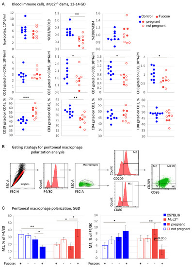 Blood immune cells ratios in Muc2+/− dams and peritoneal macrophage polarization in C57BL/6 and Muc2+/− dams. (A). Blood immune cells: Absolute numbers, percentages, and percentage ratios. “Fucose” vs. “Control”: * p < 0.05, ** p < 0.01, *** p < 0.001; Student’s t-test, N(dams) = 9 in all groups. (B). Gating strategy for peritoneal macrophage polarization analysis. (C). Percentage of M1 and M2 macrophages with and without fucose treatment in C57BL/6 and Muc2+/− dams.: * p < 0.05, ** p < 0.01, N = 6–10 in each group, Student’s t-test.