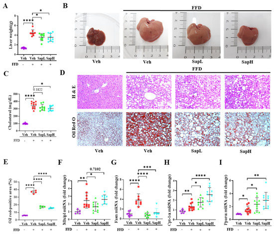 To investigate whether saponin extract treatment regulated the FFD-induced hepatic lipid accumulation in mice, mice were fed an FFD for 16 weeks to induce obesity, which is a relevant feature of NAFLD. Mice were weighed daily, and the body weights of FFD-fed mice, compared to that of NCD-fed mice, were significantly increased, as expected (Figure S1A). Surprisingly, the weight (Figure 1A) and size (Figure 1B) of the liver was significantly attenuated in the low- or high-dose saponin extract (SapL and SapH, respectively)-administered groups, compared with the vehicle group, but no effects on body weight, liver-to-body weight ratio, and food uptake were observed from saponin extract administration (Figure S1B–D). Additionally, the cholesterol levels were significantly reduced in the SapH-treated group, compared with the vehicle group (Figure 1C). Furthermore, saponin extract administration significantly alleviated the FFD-induced increase in lipid droplet accumulation (Figure 1D,E). To explore the beneficial effects of saponin extract treatment on hepatic lipid metabolism further, the expression of various genes involved in lipogenesis and fatty acid oxidation were examined. Saponin extract treatment reversed the FFD-induced elevation in the expression levels of lipogenesis-related genes, including fatty acid synthase (FASN) and MLX-interacting protein-like (MLXIPL), to the levels in NCD-fed mice (Figure 1F,G). The expression of fatty acid oxidation-related genes, including carnitine palmitoyltransferase I alpha (CPT-1α) and peroxisome proliferator-activated receptor alpha (PPARα), were upregulated in FFD mice and further enhanced on saponin extract administration (Figure 1H,I). Taken together, these results indicated that saponin extract administration ameliorated hepatic steatosis by regulating the expression of genes involved in hepatic lipid metabolism in vivo.