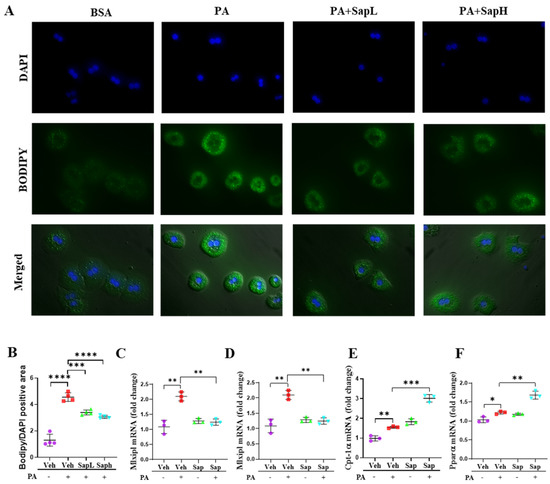To clarify the effects of saponin extract on hepatic steatosis in vitro, PA was used to induce lipid accumulation in mouse primary hepatocytes. Lipid accumulation was assessed by BODIPY staining (Figure 2A) and evaluated by quantification of the BODIPY/DAPI (diamidino-2-phenylindole)-positive areas (Figure 2B). Both SapL and SapH treatments significantly decreased the PA treatment-induced lipid accumulation. Based on these results, the various hepatic lipid metabolism-involved genes, including lipogenesis-related genes (MLXIPL (Figure 2C) and sterol regulatory element-binding protein (SREBP)-1c (Figure 2D)) and fatty acid oxidation-related genes (CPT-1α (Figure 2E) and PPARα (Figure 2F)), were detected. As shown in Figure 2F, saponin extract treatment restored the PA treatment-induced increase in SREBP-1c and MLXIPL expression and further enhanced the PA treatment-induced increase in CPT-1α and PPARα expression. According to these results, saponin extract exerted beneficial effects on hepatic steatosis by alleviating it in vivo and in vitro.
