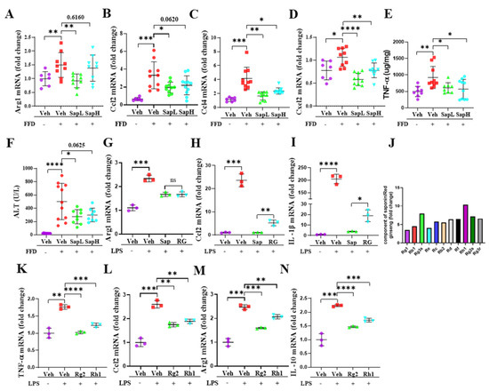 To clarify whether saponin extract exerted anti-inflammatory effects, we measured the expression levels of various inflammatory genes in the liver. As shown in Figure 4A–D, saponin extract significantly reduced FFD-induced hepatic arginase 1 (ARG1), C-C motif ligand 2 (CCL2), CCL4, and C-X-C motif ligand 2 (CXCL2) expression and the tissue tumor necrosis factor (TNF)-α level (Figure 4E), indicating that saponin extract exerted anti-inflammatory effects on FFD-induced steatohepatitis. Additionally, saponin extract treatment provided protection against FFD-induced liver injury by reducing the serum ALT level (Figure 4F). To examine the anti-inflammatory activity of saponin extract in vitro, we utilized the LPS-induced inflammation model using ImKCs. Additionally, we compared the anti-inflammatory activity of saponin extract and red ginseng. As shown in Figure 4G–I, the LPS treatment significantly altered ARG1, CCL2, and IL-1β mRNA expression, but both saponin extract and red ginseng treatments, compared with the LPS treatment, significantly decreased the inflammatory response. Moreover, saponin extract exerted greater anti-inflammatory effects than conventional red ginseng. This result prompted us to investigate whether saponin extract contained more functional compounds than red ginseng. As shown in Table 3 and Figure 4J, the saponin extract contained significantly increased amounts of several ginsenosides. Many of the upregulated ginsenosides, such as Rg1, Rg3, Rb1 [32,36], Rb2 [33], and Rd [35], were identified to be associated with NAFLD/NASH. In contrast, the role of Rh1 and Rg2 in hepatic pathophysiology remains unknown. Previous reports have hinted at a possible role of Rh1 and Rg2 in the inflammation of other organs, such as the kidneys and colon [37,38]. Thus, we then examined the anti-inflammatory effects of ginsenosides Rh1 and Rg2 and found that both ginsenosides significantly alleviated the LPS-induced expression of inflammatory genes, including TNF-α (Figure 4K), CCL2 (Figure 4L), ARG1 (Figure 4M), and IL-10 (Figure 4N), in ImKCs.