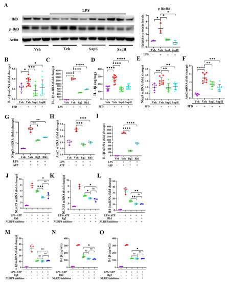 Ginsenoside Rh1 and Rg2 treatment inhibits the activation of the NLRP3 inflammasome. (A) Representative Western blotting analysis of IkB, p-IkB, and Actin. Saponin extract 62.5 µg/mL is referred to as SapH and Saponin extract 31.25 µg/mL as SapL. The mRNA expression of IL-1β in (B) liver tissue and (C) in ImKCs. (D) The protein level of IL-1β in liver tissue lysates was determined by ELISA. The mRNA expression of the NLRP3 inflammasome (E) and Aim2 inflammasome (F) in liver tissue and in ImKCs (G,H). The mRNA expression of IL-1β (I) in ImKCs. The mRNA expression of NLRP3 inflammasome treated with ginsenoside Rh1 (J) and Rg2 (K) in ImKCs. The mRNA expression of IL-1β treated with ginsenoside Rh1 (L) and Rg2 (M) in ImKCs. The protein level of IL-1β treated with ginsenoside Rh1 (N) and Rg2 (O) in the cell culture was determined by ELISA. Relative mRNA expression levels were normalized to mouse GAPDH levels. The data are expressed as means ± sem. * p < 0.05, ** p < 0.01, *** p < 0.001, and **** p < 0.0001.