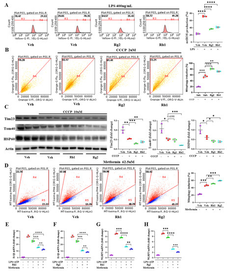 To elucidate the molecular mechanism of Rh1 and Rg2-mediated NLRP3 inhibition, we examine the effect of the ginsenosides on the mitochondria quality control, which was shown to involve the regulation of the NLRP3 inflammasome [42]. As shown in Figure 6A, the Rh1 and Rg2 treatment significantly decreased LPS-induced mtROS production and further alleviated mitochondrial damage. Since the alteration in mitophagy contributes to the accumulation of severely damaged and dysfunctional mitochondria, possibly promoting liver inflammation and NASH development [43], we analyzed the effects of Rh1 and Rg2 on mitophagy using the Mt-Keima system [44]. Rh1 and Rg2 enhanced CCCP-induced mitophagy compared with the control group (Figure 6B). As shown in Figure 6C, ginsenosides Rh1 and Rg2 significantly enhanced the CCCP-induced degradation of mitochondrial proteins such as Tom40, Tim23, and HSP60. Furthermore, ginsenoside Rh1 and Rg2 treatments also heightened the mitophagy induced by metformin (Figure 6D). We next sought to determine whether Rh1 and Rg2-increased mitophagy regulates inflammasome activation. As shown in Figure 6E–H, the metformin treatment improved IL-1β and NLRP3 inflammasome activation induced by a cotreatment with LPS and ATP, which was further decreased by Rh1 and Rg2. These results indicated that ginsenosides Rh1 and Rg2 improved the mitophagy to maintain mitochondrial homeostasis under stress and, subsequently, inhibit NLRP3 inflammasome activation.