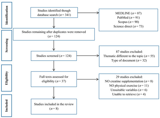 According to the purpose of the research, a search was performed in MEDLINE, PubMed, Scopus, the Directory of Open Access Journals and Science Direct databases; the keywords used included physical exercise, creatine supplementation, and oxidative stress. Our focus was on English articles published from 2008 to 2020. As shown in Figure 1, in the first stage, 341 articles were reviewed, and after removing duplicate articles and articles unrelated to the research objectives in several stages, 8 articles were selected for full study of their findings. After selecting articles and reviewing their findings on physical activity and creatine supplementation, information was collected focusing on the research objectives (Figure 1).