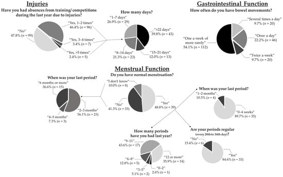 Graphical representation of some answers in the injuries (male and female athletes), gastrointestinal (male and female athletes), and the menstrual function section (female athletes) of the questionnaire.