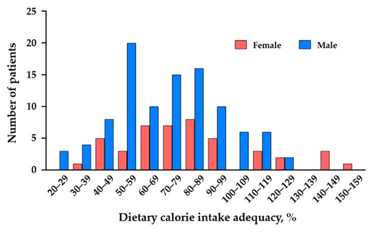 The characteristics of the total chronic HF cohort (N = 145) are summarized in Table 1. The median age of the patients with chronic HF was 67 years, and the median BMI was 22.9 kg/m2. We recruited stable outpatients with chronic HF, and 90% of the patients had an NYHA functional class I or II. The median LVEF was 45%, and both HF patients with a reduced LVEF and those with a preserved LVEF were included in this cohort. The majority of the chronic HF patients were being treated with an angiotensin-converting enzyme (ACE) inhibitor or an angiotensin II receptor blocker (ARB) and a β-blocker. For the total chronic HF cohort, the median value of dietary calorie intake was 1628 kcal/day and the dietary calorie intake adequacy rate was 75%. The distribution of the dietary calorie intake adequacy rates of the patients is shown in Figure 1.