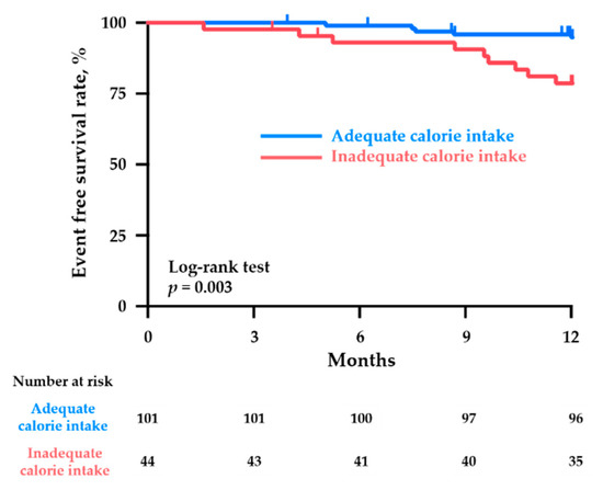 During the 1-year follow-up period, the combined clinical events of all-cause death and HF-related hospitalization occurred in 14 patients (10%) (four deaths and 10 hospitalizations). The Kaplan–Meier analysis revealed that the patients with an inadequate calorie intake had a significantly higher risk of adverse clinical events than those with an adequate calorie intake (20% vs. 5%, respectively; p < 0.01) (Figure 2).