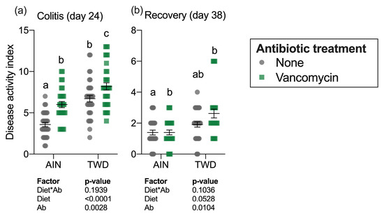 The colitis DAI was assessed on day 24 during active colitis immediately following DSS exposure and 14 days later on day 38 during recovery from gut injury (Figure 2a). Significant main effects of both diet (p < 0.0001) and vancomycin (p = 0.0028) were noted at the first time point, with the TWD diet markedly exacerbating colitis symptoms as has been observed repeatedly in this model [30]. Interestingly, vancomycin exposure compounded this effect, with the most severe colitis symptoms noted for mice fed TWD with vancomycin. Conversely, mice fed AIN with no antibiotic had the least severe colitis symptoms. By the recovery time point, the influence of diet on the DAI had abated, with antibiotic treatment still remaining a significant main effect (p = 0.0104), most notably in mice fed TWD (Figure 2b).