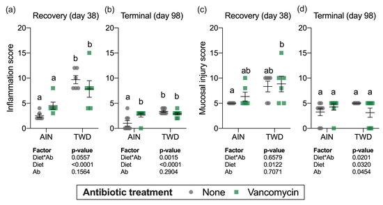 Histopathological assessment of mucosal inflammation (a,b) and mucosal injury (c,d). Values shown are the individual measurements for each animal with the mean ± standard error (n = 6 for day 38, n = 8 for day 98). Main effects of experimental factors diet, antibiotic treatment and diet*antibiotic interaction are shown as determined by generalized linear mixed model, and different letters indicate experimental groups are significantly different (p < 0.05) as determined by the Tukey HSD post hoc test. Abbreviations: AIN, the AIN93G diet; TWD, the total Western diet; Ab, antibiotic.