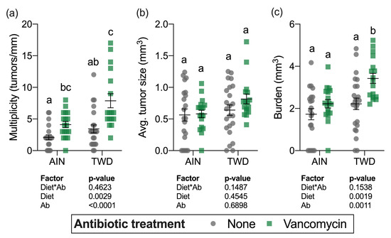 Tumor multiplicity (a), average tumor size (b) and tumor burden (c). Multiplicity was measured as the number of tumors per mouse normalized to the colon length. Tumor burden was calculated as the total tumor volume for each mouse. Values shown are the individual measurements for each animal with the mean ± standard error (n = 17 to 23). Main effects of experimental factors diet, antibiotic treatment and diet*antibiotic interaction are shown as determined by generalized linear mixed model, and different letters indicate experimental groups are significantly different (p < 0.05) as determined by the Tukey HSD post hoc test. Abbreviations: AIN, the AIN93G diet; TWD, the total Western diet; Ab, antibiotic.