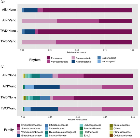 Taxonomic classification of mouse fecal bacteria. Data shown are the relative normalized abundance of bacteria annotated to phyla (a) or family (b) taxonomic levels for the top 15 most abundant taxa for each experimental group (n = 17 to 23). Taxonomic classifications for individual animals are provided in supplemental Figure S4. Abbreviations: AIN, the AIN93G diet; TWD, the total Western diet; Vanc, vancomycin.