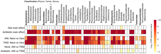 MetagenomeSeq of gut bacteria at the phylum, family, and genus taxonomic levels for main effects of diet or antibiotic and then pairwise tests for effect of antibiotic within each diet group or for diet within each antibiotic group. Values are the −log10 FDR-adjusted p-values; blank cells were not significant. Statistical results with specific p-values are available in Table S2. Abbreviations: AIN, the AIN93G diet; TWD, the total Western diet; Vanc, vancomycin.
