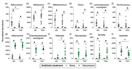 Phylogenetic heat trees shown in Figure S5 illustrate differences in relative abundance of bacteria at all taxonomic levels for the whole microbiome for the four pairwise comparisons of primary interest: comparing the effect of vancomycin within each diet group and comparing the effect of diet for vancomycin or control mice. Exploration of bacteria abundance at family and genera taxonomic levels provides greater resolution for the effects of either the basal diet or antibiotic treatment on microbiome composition. Key taxa with marked decrease in relative abundance in mice treated with vancomycin include Allobaculum (family Erysipelotrichidae), Bifidobacterium (family Bifidobacteriacea), Ruminococcus (family Ruminococcaceae), Dorea (family Lachnospiraceae), and other unassigned Lachnospiraceae taxa (Figure 7b–f and Figure S4a,b). However, no significant effects of basal diet were evident for any of these particular genera. Conversely, the relative abundance of Akkermansia (as noted above), Klebsiella (family Proteobacteria), Paenibacillus (family Paenibacillaceae), Serratia (family Enterobacteriaceae) and Sutterella (family Sutterellaceae) as well as unassigned members of the Enterobacteriaceae family were markedly increased in mice provided vancomycin (Figure 7g–l and Figure S4a,b). While most changes in bacteria abundance in response to the antibiotic treatment were consistent with respect to the basal diet, some interactions were evident suggesting a differential effect of vancomycin in the context of the Western diet (Figure S5c,d). For example, the relative abundance of Adlercreutzia (family Coriobacteriacea) was lower in mice fed the TWD compared to the AIN diet in the absence of antibiotic treatment (p = 2.91 × 10−4), while vancomycin eradicated this genus altogether in mice consuming either diet (p = 1.46 × 10−13 for AIN diet and = 1.70 × 10−9 for TWD diet) (Figure 7a and Figure S4c,d). In response to vancomycin, Sutterella spp. were significantly more elevated in mice fed the AIN diet as compared to those fed TWD (p = 0.0455) (Figure 7l), while the opposite pattern was noted for Klebsiella spp. (p = 0.0455) (Figure 7i).