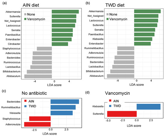 Lefse analysis of discriminating features revealed that many of the same genera were discriminating for either control or vancomycin treatment, regardless of the basal diet (Figure 10a,b). Akkermansia was the strongest discriminating feature for vancomycin treatment in both diet groups, with Lactococcus, Sutterella, Serratia, Paenibacillus, and Enterobacter also indicating antibiotic exposure. Conversely, Allobaculum was the most discriminating for the control mice, with other indicator genera including Adlercreutzia, Bacteroides, Ruminococcus, Lactobacillus, and Bifidobacterium. Many fewer genera discriminated the basal diet, and those significant taxa differed depending on the antibiotic treatment. For control mice, Bacteroides, Rummeliibacillus, and Weissella genera indicated mice fed TWD compared to Adlercreutzia and Staphylococcus that discriminated mice fed the AIN diet (Figure 10c). In mice treated with vancomycin, only two discriminating taxa were noted with Klebsiella indicating the TWD and Suterella the AIN basal diet (Figure 10d).