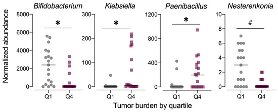 Normalized abundance of selected microbiota taxa at the genus level for samples segregated by tumor burden into quartiles. Values shown are the individual measurements for each animal in either the lowest quartile (Q1) or highest quartile (Q4) of tumor burden with the mean ± standard error (n = 19/quartile). # indicates p < 0.10 for tumor burden stratified by quartile as determined by metagenomeSeq using a zero-inflated gaussian fit statistical model. Complete results for all taxa are provided in Table S2.