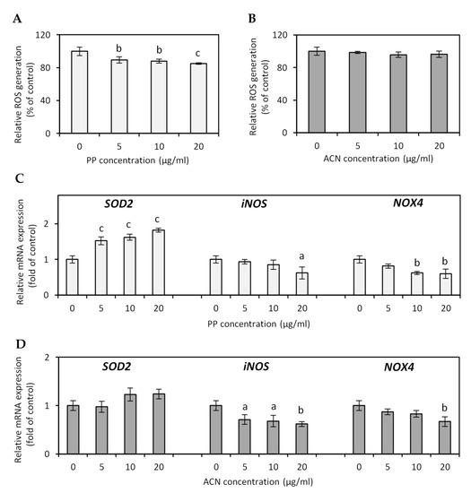 Effect of anthocyanin (ACN) and non-anthocyanin polyphenol (PP) fraction on the intracellular ROS production (A,B) and antioxidant and pro-oxidant enzymes mRNA expression (C,D) in hypertrophied 3T3-L1 adipocytes. Data are the mean values ± SD (n = 3). a p < 0.05, b p < 0.01, c p < 0.001.