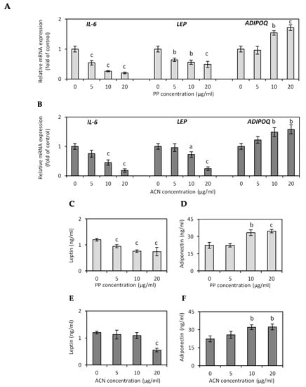 Effect of non-anthocyanin polyphenol (PP) and anthocyanin (ACN) fractions on adiponectin (ADIPOQ), leptin (LEP), and interleukin-6 (IL-6) gene expression (A,B), and adiponectin (D,F) and leptin (C,E) protein secretion by hypertrophied 3T3-L1 adipocytes. Data are the mean values ± SD (n = 3). a p < 0.05, b p < 0.01, c p < 0.001.