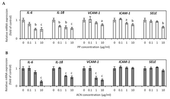 Effect of non-anthocyanin polyphenol (PP) fraction (A) and anthocyanin (ACN) fraction (B) on inflammatory-related gene expression in HUVECs. Data are the mean values ± SD (n = 3). a p < 0.05, b p < 0.01, c p < 0.001.