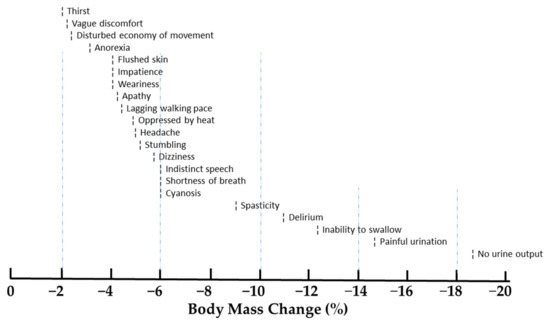 The classic desert field observations of Adolph and colleagues [12] during the mid-1940s were among the first descriptions of exercise-induced dehydration that approached and exceeded 10% body mass loss. Although Adolph’s systematic observations of dehydrated soldiers walking in the desert (Tamb > 37 °C) were not subject to statistical analyses, they provide a thorough description of the detrimental health effects of prolonged dehydration. Figure 1 presents a summary of the signs and symptoms that were reported when dehydration exceeded 2%. The following Section 2.2.1 through Section 2.2.3 describe disorders that result from water and salt deficiencies.
