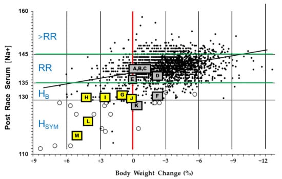 The relationship between body weight change (%) and serum Na+ after 4.0–13.3 h of exercise (n = 2135) as modified from [20]. Solid circles (●) represent asymptomatic marathon runners and Ironman triathletes. Open circles (○) depict athletes with severe symptoms including hyponatremic encephalopathy (central nervous system dysfunction due to brain swelling). Horizontal zone abbreviations: >RR, serum Na+ concentration above resting normal; RR, the laboratory reference range for healthy adults (green horizontal boundaries); HB, biochemical hyponatremia which involves few or no symptoms; HSYM, symptomatic hyponatremia. Symbols A–M were overlaid by the present author (see details below in Section 3.2.1). Gray highlighted symbols depict individuals with fluid intake rates of ≤700 mL/h and body mass losses of 0.1 to 2.6%. Yellow highlighted squares indicate exertional hyponatremia cases (each n = 1) with fluid intake rates ranging from 733–2061 L/h and body mass increases of +0.1 to +5.0%. Reprinted via the PNAS Open Access option from [20].