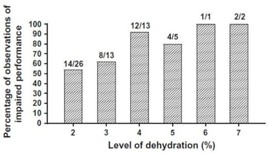 The effects of dehydration on exercise performance. Fractions represent the number of statistically significant (p < 0.05) observations out of the number at each level of body mass loss. Across all dehydration levels, 68% of comparisons indicated impairment. Reprinted from [32] via the Creative Commons Attribution 4.0 International License (http://creativecommons.org/licenses/by/4.0/) accessed on 2 March 2021.