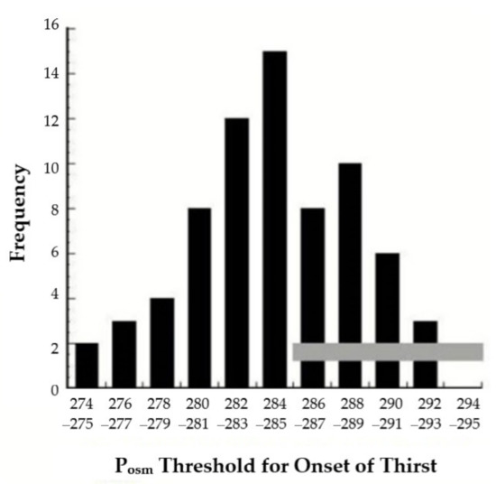Frequency distribution of the plasma osmolality (Posm) threshold for the onset of thirst. The horizontal gray bar delineates the laboratory reference range of Posm values (285–295 mOsm/kg) for healthy adults. Reprinted under the terms and conditions of the Creative Commons Attribution (CC BY) license (http://creativecommons.org/licenses/by/4.0/) accessed on 2 March 2021. Modified from [97].
