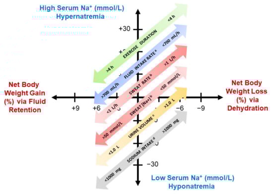 - Montain, S.J.; Cheuvront, S.N.; Sawka, M.N. Exercise associated hyponatremia: Quantitative analysis for understand the aetiology. Br. J. Sports Med. 2006, 40, 98–106. [Google Scholar] [CrossRef]