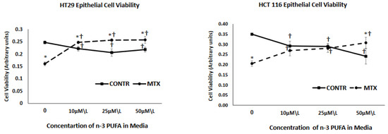The effect of MTX and increasing concentrations of n-3 PUFAs on HT 29 and HCT 116 cell viability. PrestoBlue® assay was used to evaluate cell viability. MTX-methotrexate, n-3 polyunsaturated fatty acids. Values are mean ± SEM. * p < 0.05 MTX-treated vs. MTX-non-treated cells, † p < 0.05 viability late vs. initial.