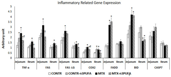 Effects of MTX and n-3 PUFAs on pro-inflammatory and apoptosis related gene expression. Real Time PCR was used to investigate gene expression. Relative changes in gene expression were normalized to housekeeping genes GAPDH and Tubulin. Values are mean ± SEM. CONTR-control, MTX-methotrexate, n-3 PUFAs- n-3 polyunsaturated fatty acids. * p < 0.05 all groups vs. CONTR rats, † p < 0.05 MTX-n-3 PUFAs vs. MTX rats.