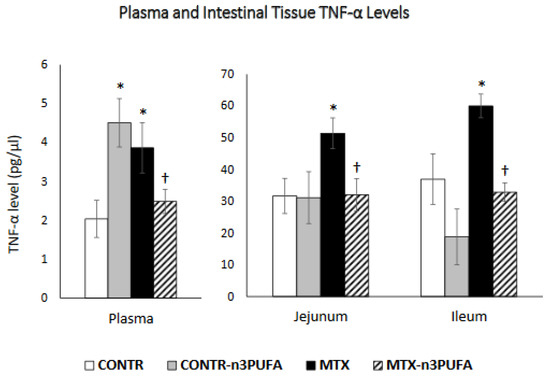 Changes in TNF-α levels in plasma and intestinal tissue during MTX induced intestinal damage and exposure to n-3 PUFAs. Enzyme-linked immunosorbent assay (ELISA) was used to determine TNF-α levels. Values are mean ± SEM. CONTR- control, MTX-methotrexate, n-3 PUFAs. * p < 0.05 all groups vs. CONTR rats, † p < 0.05 MTX-n-3 PUFAs vs. MTX rats.