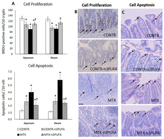 Effects of MTX and n-3 PUFAs on crypt cell proliferation (A,B) and apoptosis (A,C). Crypt cell proliferation was assessed using 5-bromodeoxyuridine (5-BrdU). Immunohistochemistry for Caspase-3 was performed for identification of apoptotic cells. Values are mean ± SEM. CONTR- control, MTX-methotrexate, n-3 PUFAs. * p < 0.05 all groups vs. CONTR rats, † p < 0.05 MTX+n-3 PUFAs vs. MTX rats.