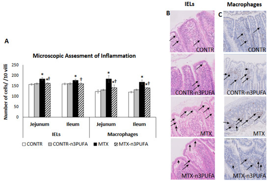 Grade of intestinal inflammation after administration of MTX and treatment with n-3 PUFAs. Immunohistochemistry with CD 68 antibody was performed to identify macrophages (A,C). The number of intraepithelial lymphocytes (IELs) was assessed by H&E staining and was calculated per 10 villi (A,B). Values are mean ± SEM. CONTR- control, MTX-methotrexate, n-3 PUFAs- n-3 polyunsaturated fatty acids. * p < 0.05 all groups vs. CONTR rats, † p < 0.05 MTX+n-3 PUFAs vs. MTX rats.