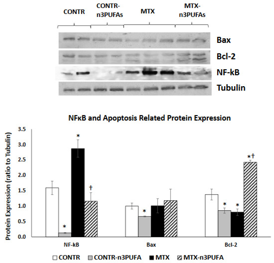Changes in intestinal mucosal NF-κB, Bax and Bcl-2 protein levels following methotrexate induced intestinal damage and treatment with n-3 PUFAs. Values are mean ± SEM. CONTR-control, MTX-methotrexate, n-3 PUFAs. * p < 0.05 all groups vs. CONTR rats, † p < 0.05 MTX-n-3 PUFAs vs. MTX rats.
