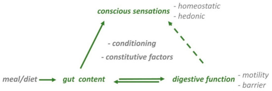 Alteration of digestive function impairs the postprandial experience. For instance, experimental distortion of gastric accommodation produced by distension of the stomach with a balloon, was associated with fullness sensation and impaired hedonic responses to a probe meal [19]. Patients with postprandial symptoms (functional dyspepsia) exhibit impaired gastric accommodation and hypersensitivity of the stomach, so that physiological meal-related stimuli induce abnormal sensations [12,20,21,22]; see Section 6.2 Functional gut disorders).