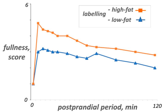 Homeostatic and hedonic sensations decrease in intensity during the postprandial period: the consummatory reward fades and as satiety exhausts, while rising hunger sensation calls for the next meal. Experimental data suggest that different biological mechanism mediate homeostatic and hedonic components of the postprandial experience [3]. For example, studies combining measurement of sensations and brain activity show that specific changes in brain activity are selectively related to homeostatic or hedonic sensations [3,4,5]. Some of the changes in blood levels of compounds that originate from the food (e.g., glucose, lipids), from the subject (e.g., gut hormones) or from the microbiota metabolism of meal residues are selectively related to specific postprandial sensations [6,7].