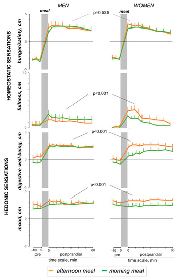 As discussed above, perception of meal-related stimuli in the gut is influenced by conditioning factors. A study investigated the effect of the eating schedule, comparing the responses to a consistent savory lunch-type meal (stewed beans) eaten at the customary afternoon schedule or in the morning. The sensory experience induced by the probe meal, predominantly postprandial satisfaction, was weaker when eaten at an unconventional time (i.e., at breakfast) in women. While men were resilient to the changes in the customary eating schedule and experienced the same sensations regardless of the timing of ingestion; the effect of the eating schedule was significantly more pronounced in women for fullness, digestive well-being and mood. This was not associated todifferences in the physiological responses induced by the afternoon and morning meals both in women or men [98] (Figure 3). Hence, women are more susceptible to conditioning. Functional gut disorders are more frequent in women than men, and sex differences in the response to meal ingestion, particularly the susceptibility to conditioning, may explain the predisposition of women to meal-related complaints. Furthermore, it has been also shown that neural processes mediating aversive visceral learning are different in women and men [99].