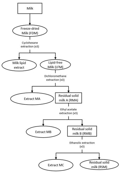 The residual solid from the absolute ethanol extraction was dried under vacuum and named residual solid milk (RSM). Each dried milk extract was kept in a waterproof container at −25 °C, under argon.