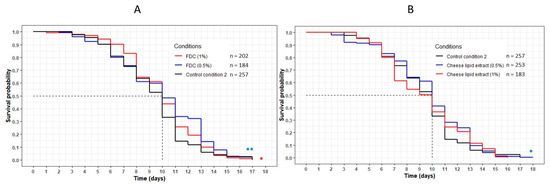 Influence of the FDC (freeze-dried cheese) (A) and the cheese-lipid extract (B) on the lifespan of C. elegans GR1307 strain. The worms were incubated on the medium supplemented with the dried extracts at day 0 and regularly fed with HK E. coli OP50. The conditions were considered significantly different when the p-value was lower than 0.05 (*) or 0.01 (**) (log-rank test). The asterisks next to the curves represent the differences with the control condition CC2. The asterisks next to the legend represent the differences between the extracts.