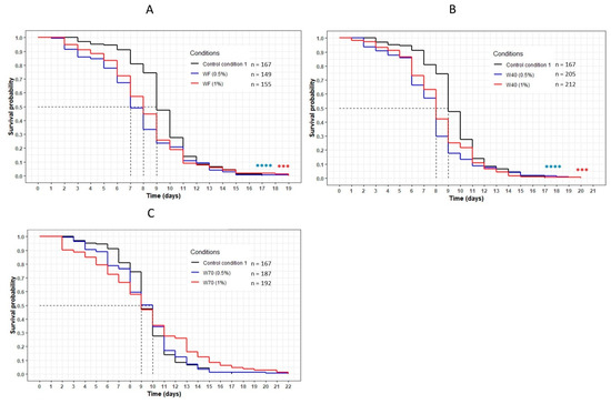 The worms incubated with the dried aqueous cheese extracts WF and W40 had a significant decrease in their lifespan compared with the control CC1 (p < 0.001) (Figure 3A,B). The curves representing these extracts were significantly below the CC1 curve, with a decrease in the mean lifespan from 9 (CC1) to 8 days (WF at 1%, W40 at 0.5% and 1%). Concerning WF at 0.5%, the mean lifespan decreased from 9 to 7 days (Table 4). However, the maximum lifespan was higher for all conditions, with an increase of between 12% and 18% compared with CC1. Concerning the extract W70, no variation in lifespan was observed in comparison with CC1. The evolution of the curve was similar to that of the control condition for both concentrations (Figure 3C). An increase in the maximum lifespan was noted for a small proportion of the population of the worms (up to 5% of the population).
