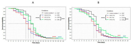 Comparison of the effect of the aqueous extracts WF, W40 and W70 at 0.5% (A) and 1% (B) concentration on the C. elegans GR1307 strain lifespan. The worms were incubated on the medium supplemented with the dried extracts obtained with water at day 0 and regularly fed with HK E. coli OP50. The conditions were considered significantly different when the p-value was lower than 0.001 (***) or 0.0001 (****) (log-rank test). The asterisks next to the curves represent the differences with the control condition CC1. The asterisks next to the legend represent the differences between the extracts.