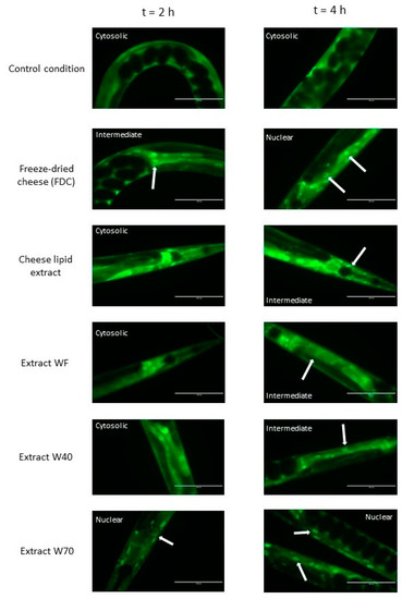 The effects of the FDC (freeze-dried cheese) and the extracts on DAF-16 cellular localization in C. elegans transgenic strain TJ356 expressing DAF-16::GFP, after 2 h and 4 h of incubation on the supplemented medium. The arrows indicate the accumulation of the transcription factor in the nuclei. Scale bar: 100 µm.