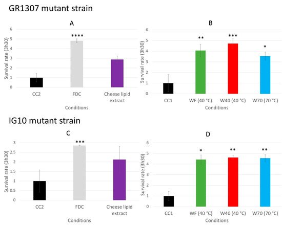 The relative survival rates of the C. elegans GR1307 strain (DAF-16 loss-of-function) (A,B) and IG10 strain (TOL-1 loss-of-function) (C,D) on an oxidative medium after 5 days of incubation on a medium supplemented with the cheese extracts (FDC (freeze-dried cheese), cheese-lipid extract and aqueous extracts WF, W40 and W70). The conditions were considered significantly different from the control when the p-value was lower than 0.05 (*), 0.01 (**), 0.001 (***) or 0.0001 (****) (Kruskal–Wallis test).