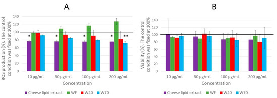 The effect of the cheese-lipid extract, WF, W40 and W70 on the ROS production in the leukocytes (A) and the viability of the leukocytes (B). The cells were treated with the indicated concentrations of the extract for 2 h, and measurements were made every 30 min. Data were expressed as relative production or viability in comparison with the control which was fixed at 100%. The conditions were considered significantly different from the control when the p-value was lower than 0.05 (*), 0.01 (**) (Kruskal–Wallis test).