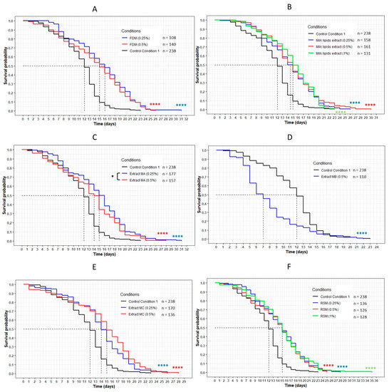 The influence of FDM (freeze-dried milk) (A), milk lipid extract (B), extracts MA (obtained with dichloromethane) (C), MB (obtained with ethyl acetate) (D), MC (obtained with ethanol) (E) and RSM (residual solid milk) (F) on the lifespan of wild-type C. elegans N2 strain. The worms were incubated on the medium supplemented with the dried extracts at day 0 and regularly fed with HK E. coli OP50. The conditions were considered significantly different when the p-value was lower than 0.05 (*) or 0.0001 (****). The asterisks next to the curves represent the differences with the control condition CC1. The asterisks next to the legend represent the differences between the extracts (log-rank test).